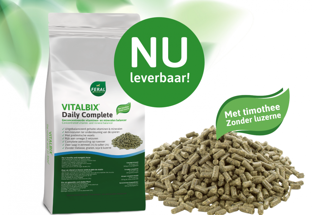 Gebruik Vitalbix Daily Complete Timothy als complete aanvulling op het ruwvoer of combineer met Vitalbix Active+ vezelrijke sportmuesli voor extra energie.
